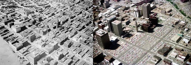 Along with this came a wave of “urban renewal,” resulting in huge swathes of cities being demolished and replaced with housing projects or surface parking lots.
